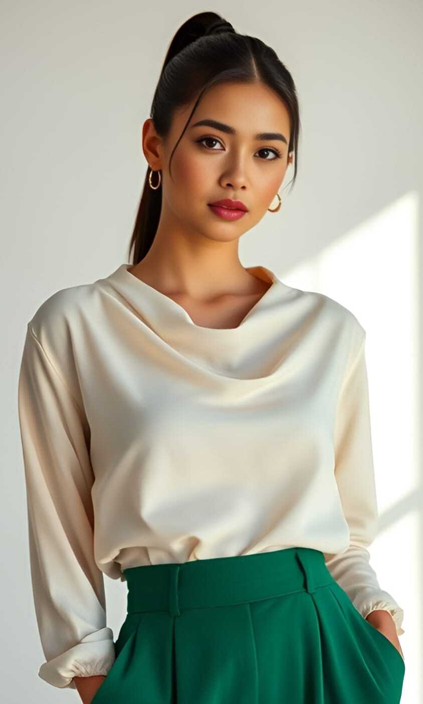 Step into timeless sophistication with our one-page fashion guide featuring a chic satin drape-neck blouse and emerald green tailored trousers. This high-value PDF delivers everything you need to recreate the look effortlessly: